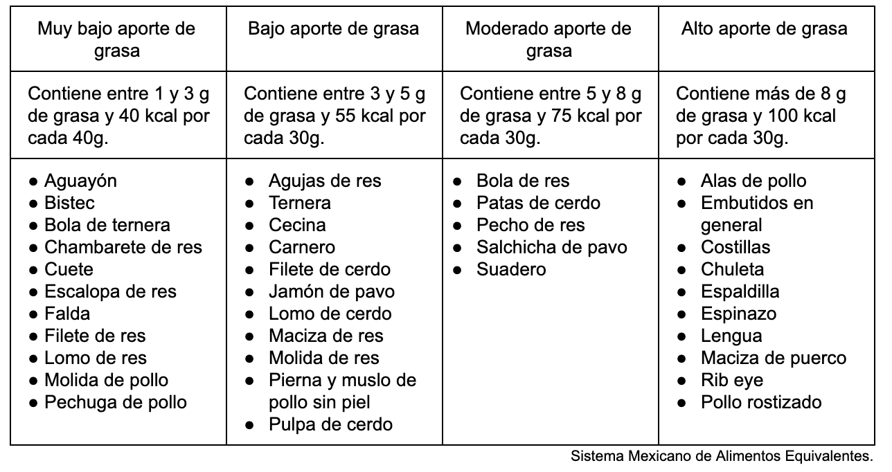 El término “carne” es fuente continua de confusión debido a la gran variedad que hay sobre este alimento. Se clasifica según la concentración de mioglobina (responsable del color rojo), es decir, como carne roja o carne blanca, al aporte de grasa y, en caso de ser transformada, al proceso que se le da (salazón, curado, fermentación, ahumado, entre otros). Con base en esta clasificación, el Sistema Mexicano de Alimentos Equivalentes las clasifica en 4 grupos: muy bajo, bajo, moderado y alto aporte de grasa.