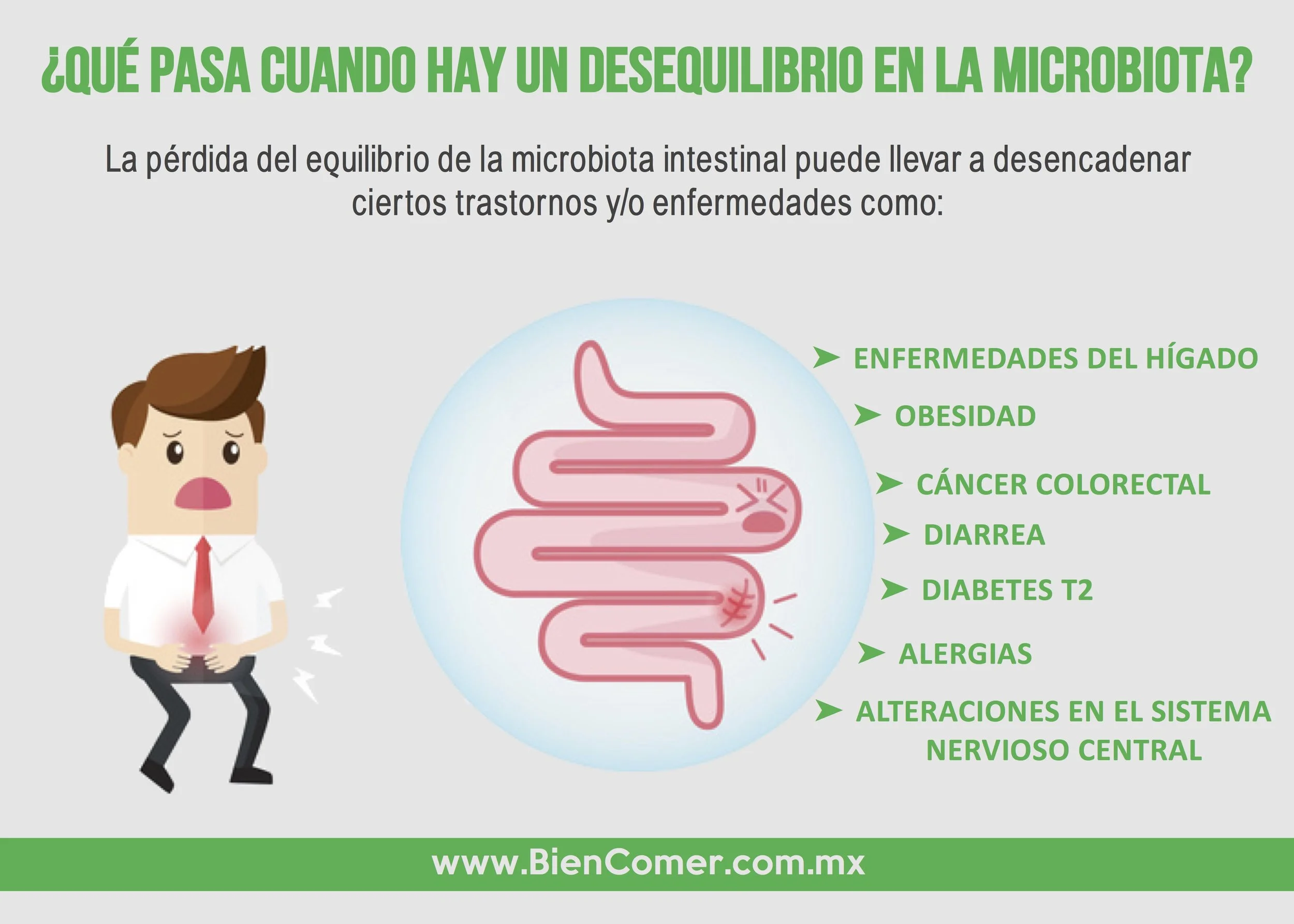 La disbiosis refiere un desequilibrio en la microbiota. Esta alteración pude afectar a la digestión, absorción de nutrimentos, producción de vitaminas y debilitamiento del sistema inmunológico.