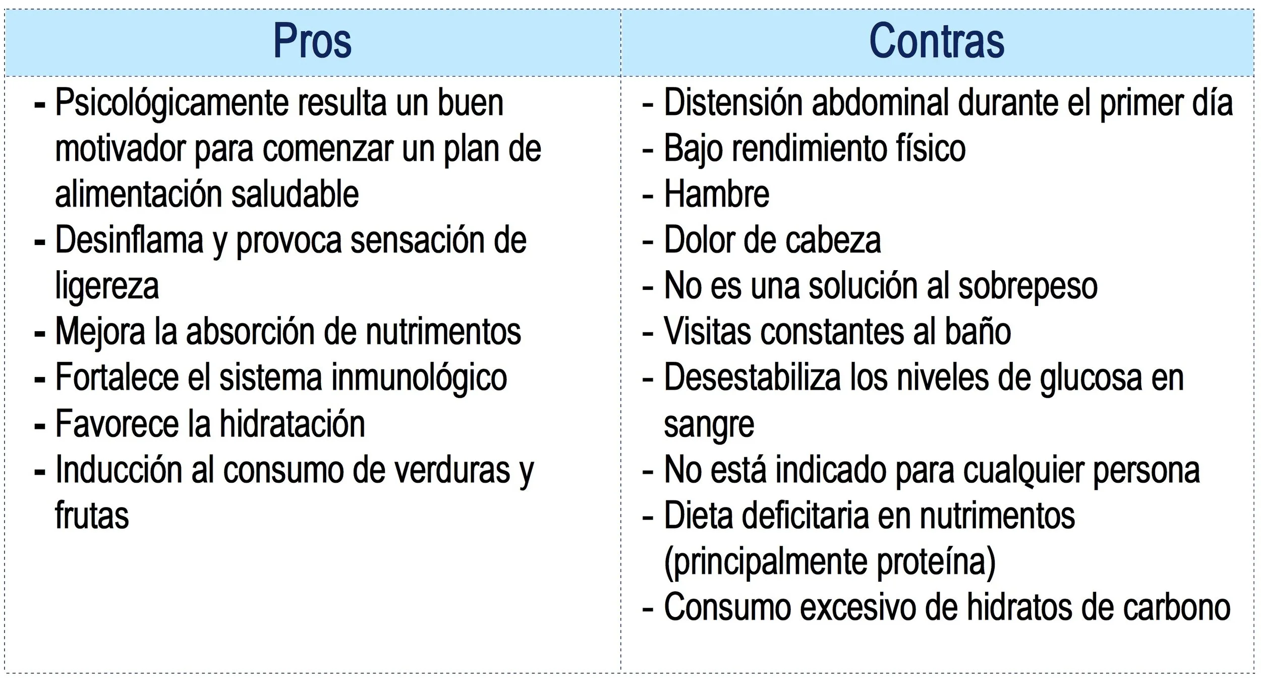 En general y de acuerdo a mi experiencia, los pros y los contras de un plan de desintoxicación a través de jugos se resume en: