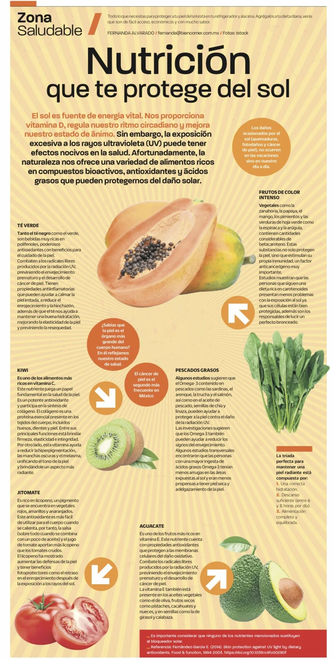 El sol es fuente de energía vital. Nos proporciona vitamina D, regula nuestro ritmo circadiano y mejora nuestro estado de ánimo. Sin embargo, la exposición excesiva a los rayos ultravioleta (UV) puede tener efectos nocivos en la salud. Afortunadamente, la naturaleza nos ofrece una variedad de alimentos ricos en compuestos bioactivos, antioxidantes y ácidos grasos que pueden protegernos del daño solar.