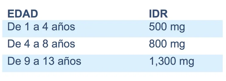 Los huesos crecen sin pausa desde que nacemos hasta la edad adulta, por tanto deben nutrirse diariamente. La ingesta diaria recomendada (IDR) de calcio para niños mexicanos varía según la edad, mientras más crecen, mayor será su requerimiento.