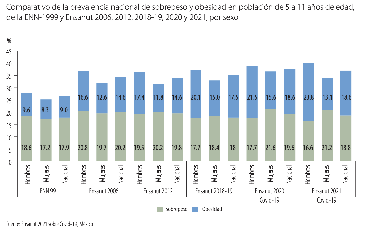 La mayoría de las opciones en los menús infantiles son platos con atractivas propiedades organolépticas, ricos en sodio, azúcar y grasas poco saludables. Además de que suelen aportar muchas calorías y poca nutrición, incitan a comer en exceso, lo que deriva en un probable aumento de peso. Desafortunadamente México está entre los primeros lugares de obesidad infantil. Según la última encuesta de salud y nutrición, ENSANUT 2020, la prevalencia de sobrepeso y obesidad en niños de 5 a 11 años es de 19% (2).