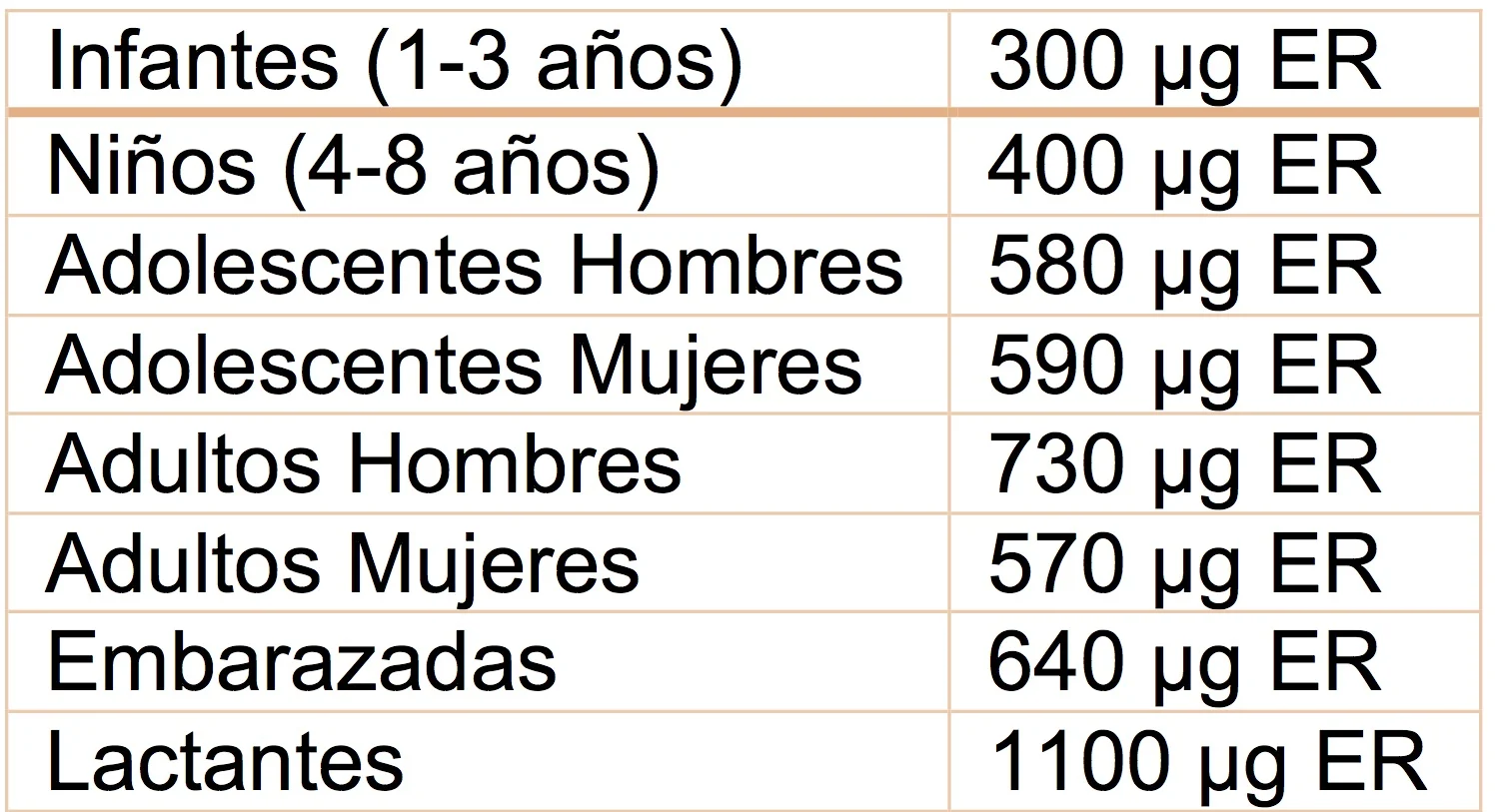 Si bien la vitamina A- retinol se obtiene sólo de alimentos de origen animal como lácteos, huevo, aceite de pescado, carne de res, pescado, aves y alimentos fortificados, los carotenos (el betacaroteno es el más importante para la nutrición humana) se consideran pro-vitamina A porque se pueden convertir en vitamina A. Están contenidos en granos y alimentos vegetales de color rojo, amarillo y anaranjado.